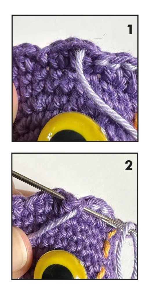 A very helpfull video for this free cheeken crochet pattern, but also for all your other Amigurumi. - Embroider a line with lilac yarn on round 11 (photo 1&2)