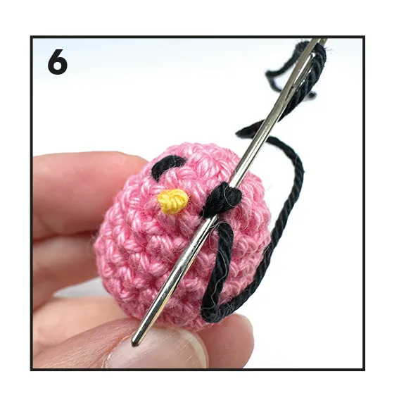 - With black yarn embroider two eyes over round 3 (photo 6), with 2 stitches between both eyes. To make the beak, embroider a french knot (see illustration) between rounds 3 and 4.