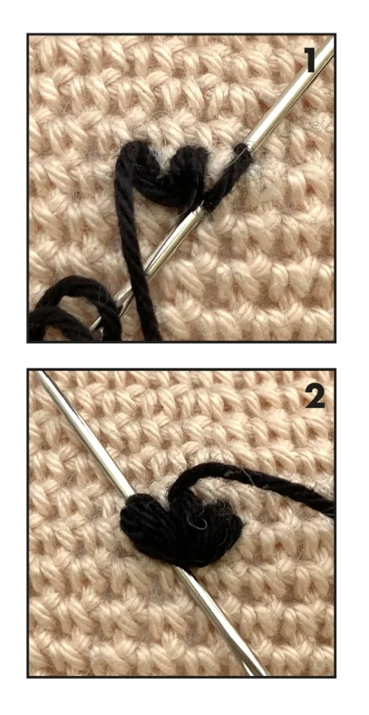 - Embroider two stripes between round 1 and 2 (one stitch width). Hide the black yarn inside the paw.