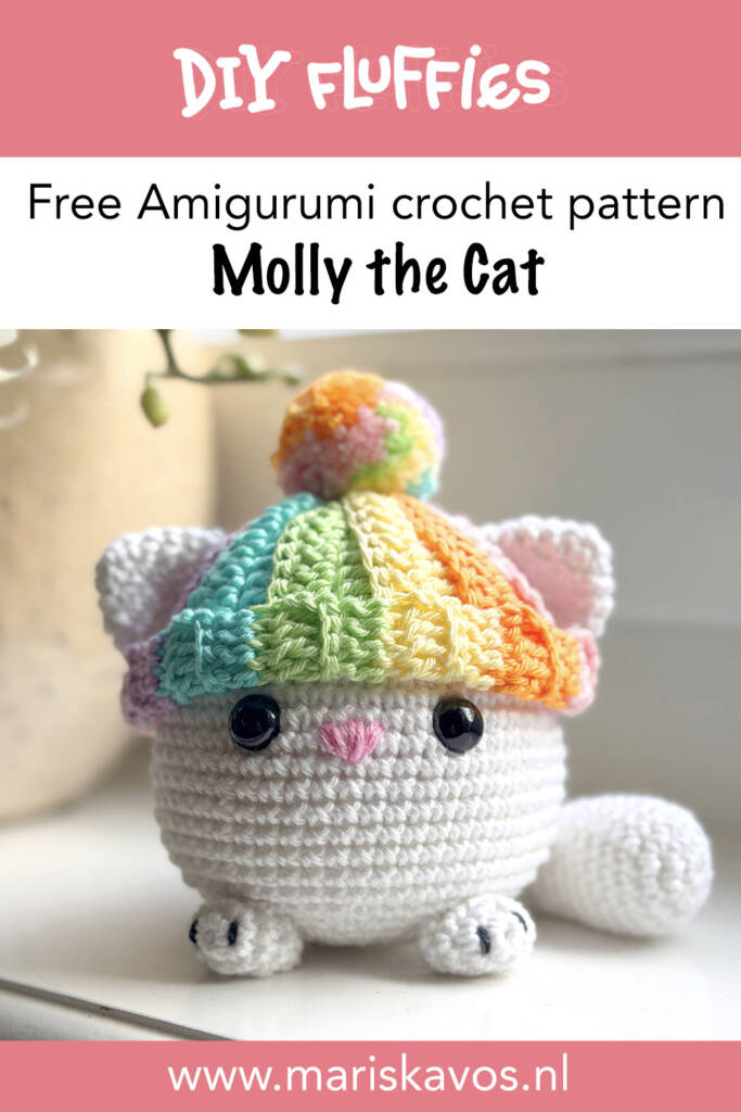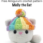 Crochet an adorable Molly the Cat with a rainbow-colored hat with this free cat crochet pattern. This easy amigurumi cat pattern for beginners includes many helpfull tips to guide you through the process.
