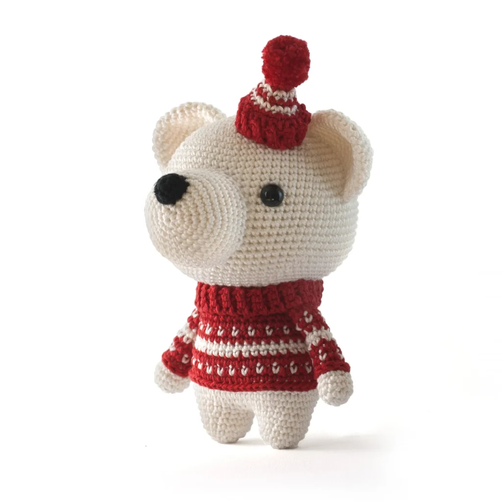 The polar bear in the photo was made with sport-weight cotton yarn and a B/1 (2.5 mm) hook. If you use the same yarn, your polar bear will be 7 inches (18 cm) tall. Use thicker yarn if you want to create a bigger polar bear.