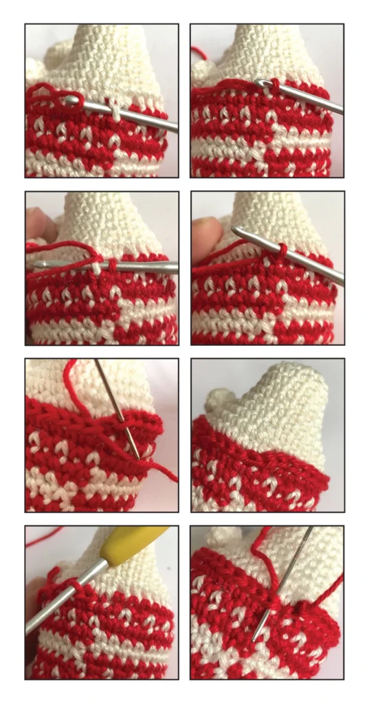 - Rnd 12: (sc in next st, change color to white, sc in next st, change color to red) repeat 3 times , sc in next st (7)