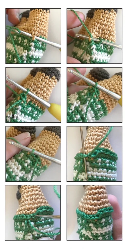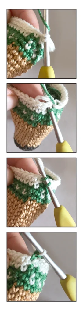- Rnd 12: (change color to white, sc in next st, change color to green, sc in next st) repeat 3 times , sc in next st (7)